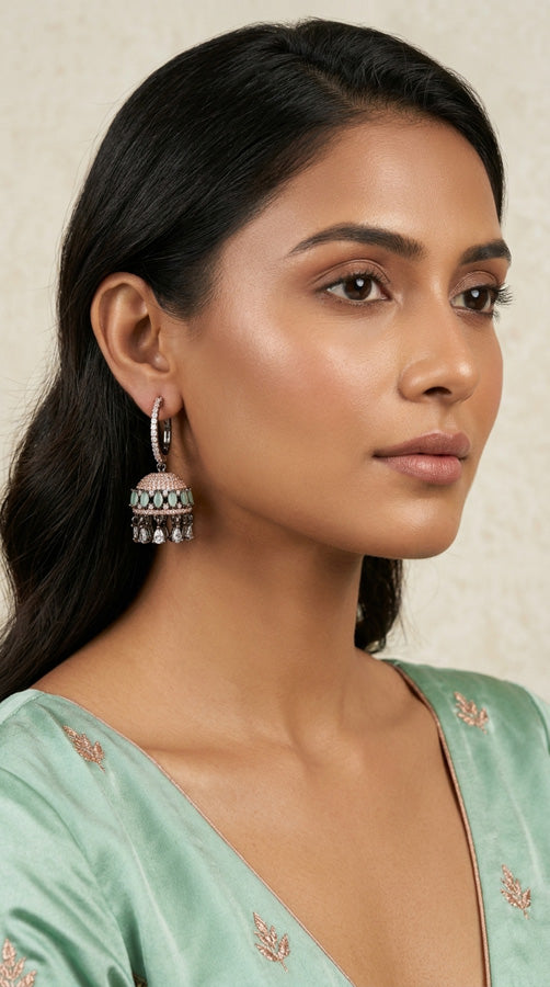 Balia / Hoops Earrings With Small Jhumka Attached And Mint Green Colour Stones (ADE016-MG)