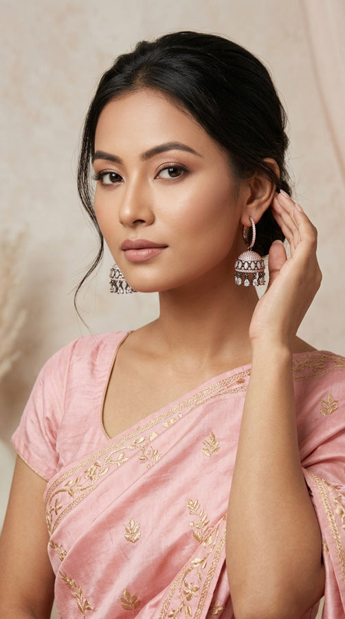 Balia / Hoops Earrings With Small Jhumka Attached And Pink Colour Stones (ADE016-P)