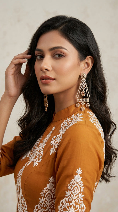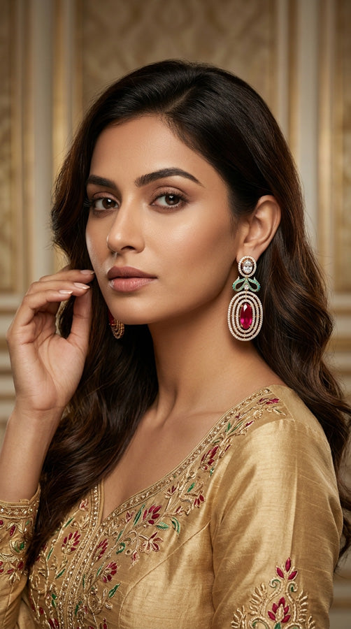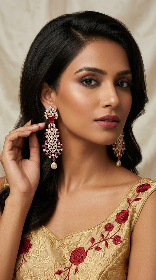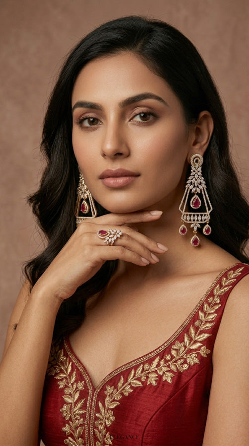 Long Fully Filling Earrings With Ruby Colur Center Stone In Gold Polish (ADE011-RU)