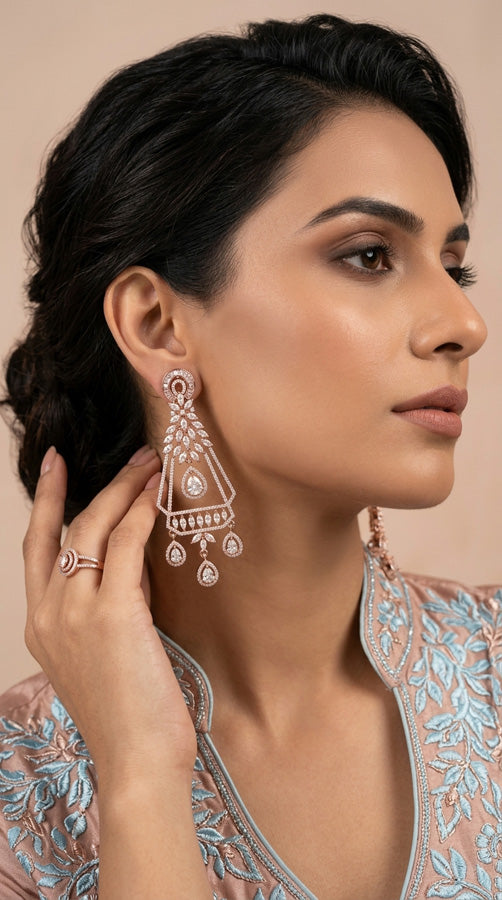 Premium Quality Rose Gold Polish Danglers With Center Design And Silver Colour Stones (ADE013-S)