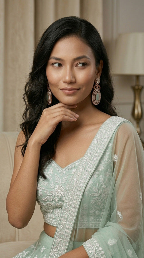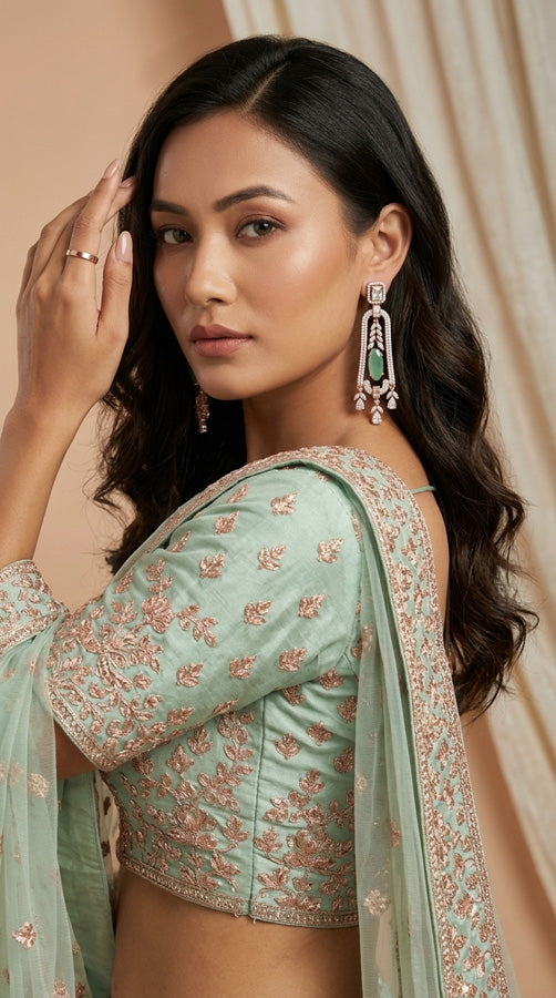 Rose Gold Polish Long And Slim American Diamonds Earrings With Mint Green Colour Center Stone (ADE014-MG)