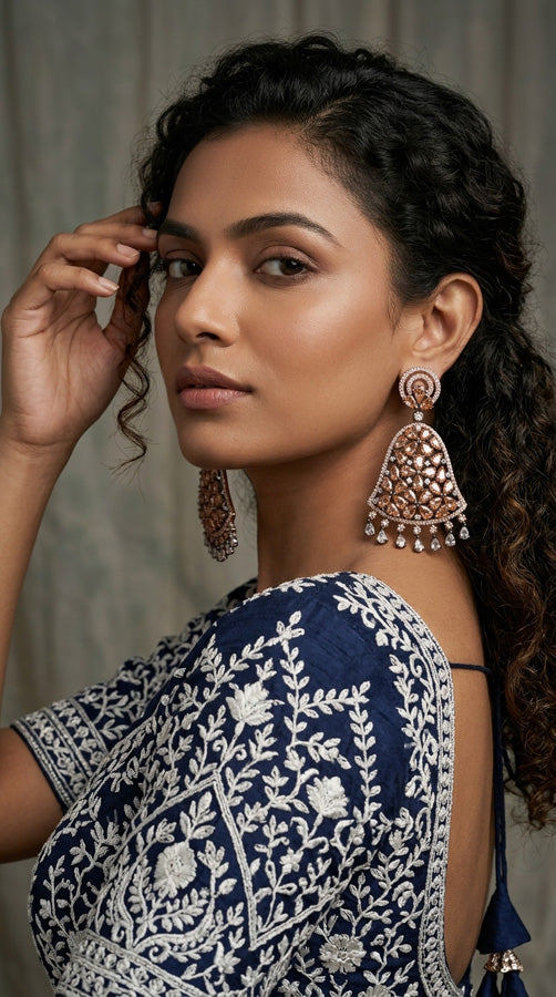 Rose Gold Polish Long And Slim American Diamonds Earrings With Blue Colour Center Stone (ADE014-B)