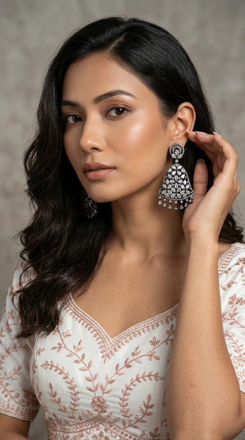 Statement Chandelier Earrings With American Diamonds Stones In Black Polish And White Colour Stones (ADE029-B)